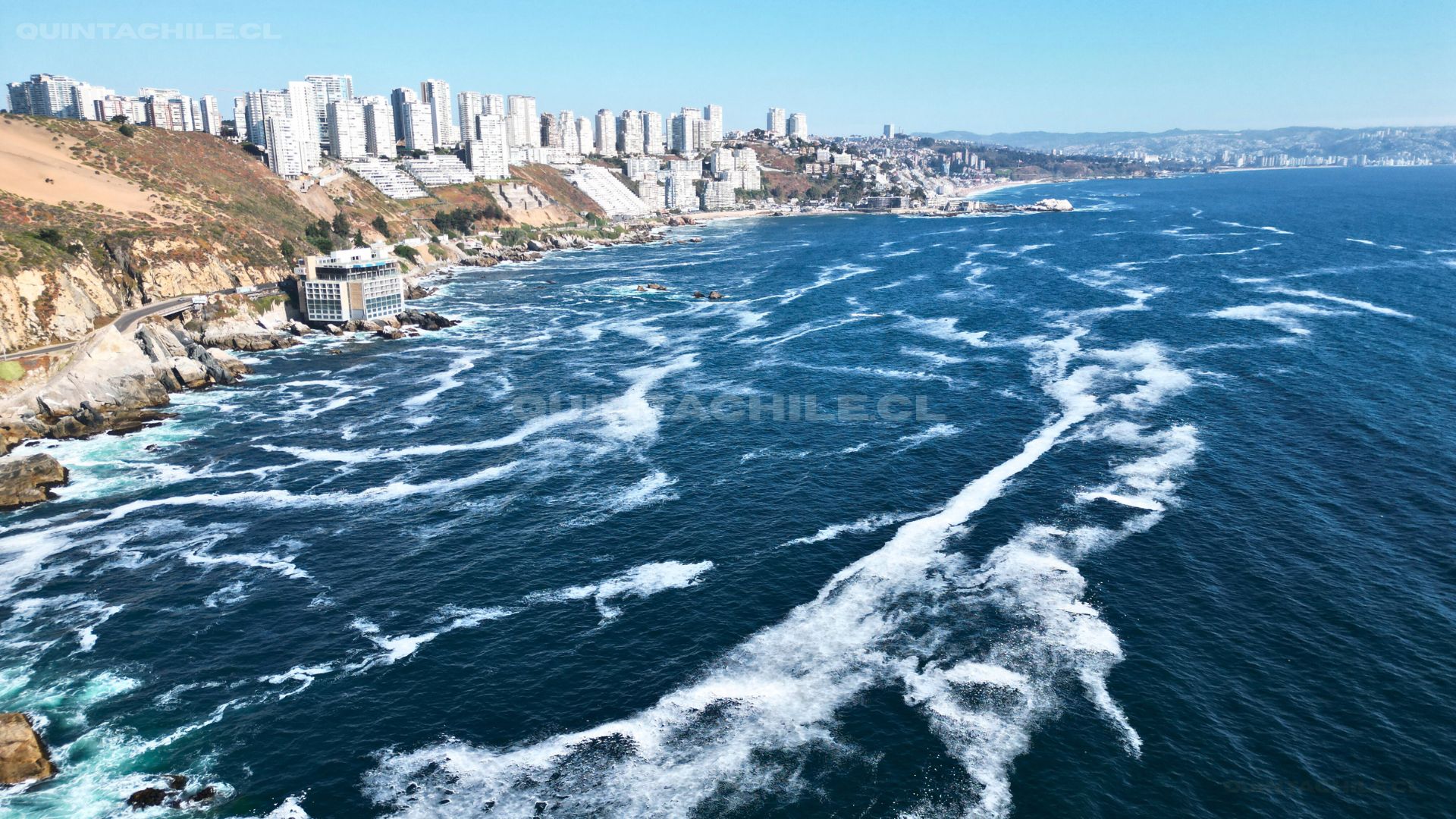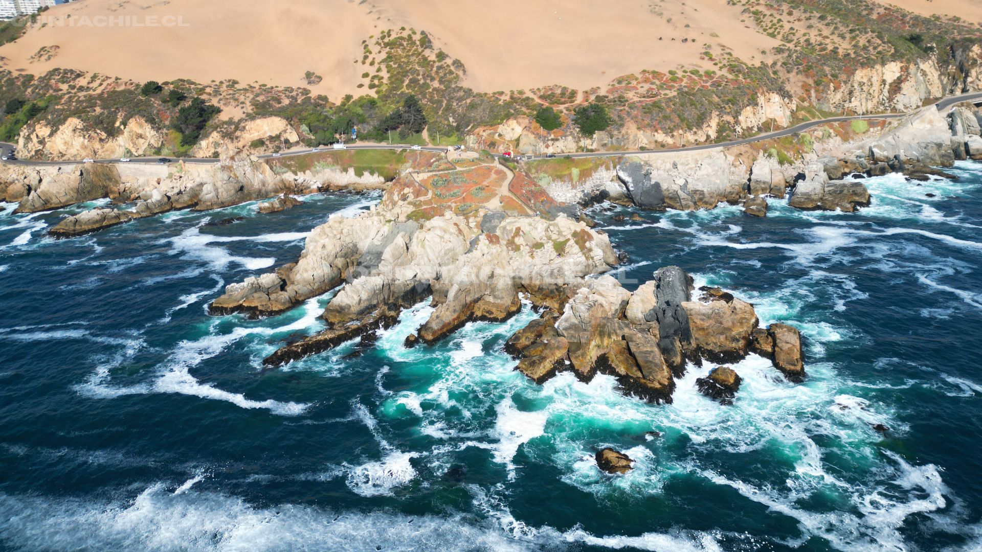El guardián de piedra: Un Santuario de la Naturaleza bajo la lente aérea. Desde el cielo, la Roca Oceánica de Concón se manifiesta como un enclave geológico vital, donde la fuerza del Pacífico sur ha esculpido durante milenios un refugio para la biodiversidad. Esta perspectiva cenital nos permite apreciar la magnitud de su ecosistema intermareal y la importancia de preservar este monumento natural que divide la bravura del océano de la paz de la bahía. Concón